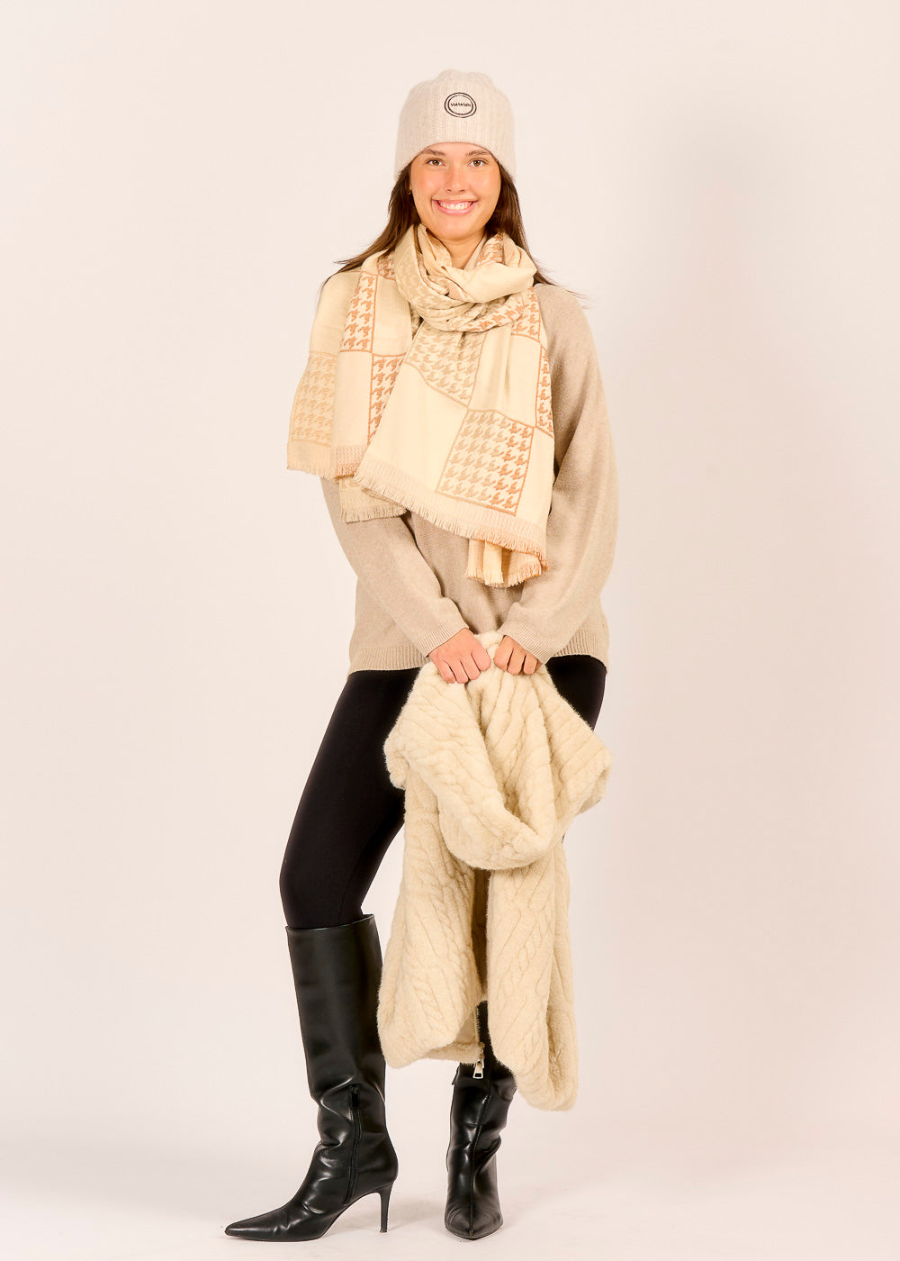 Dieses Tuch mit elegantem Hahnentritt-Muster verbindet raffinierte Patchwork-Optik mit einer besonders weichen Haptik – ein Accessoire, das jedes Outfit stilvoll ergänzt. Vielseitig kombinierbar, schenkt es dir aber vor allem Wärme an kalten Tagen.