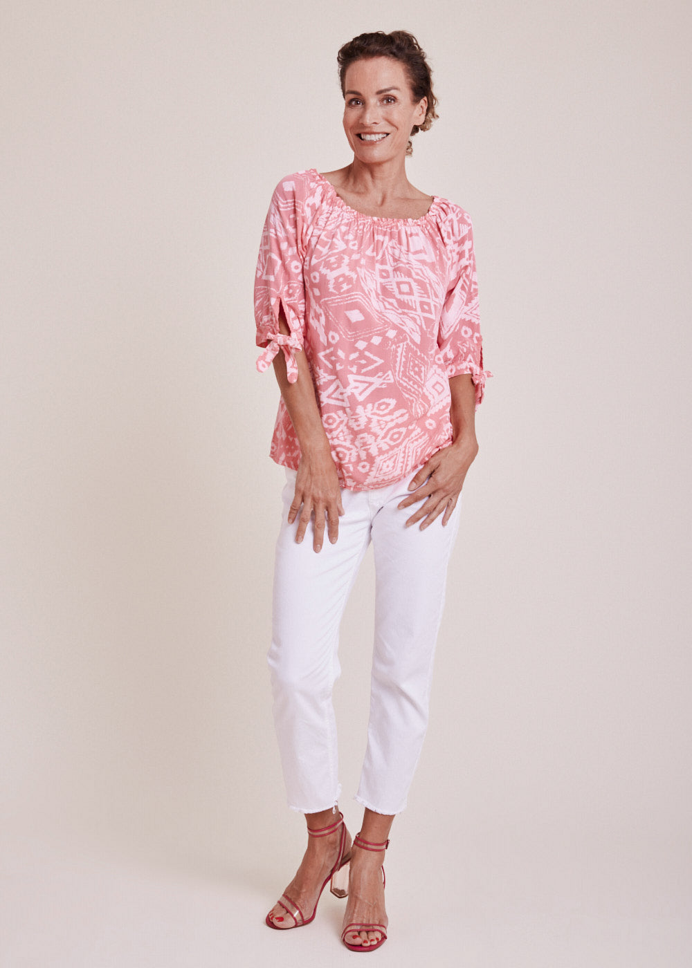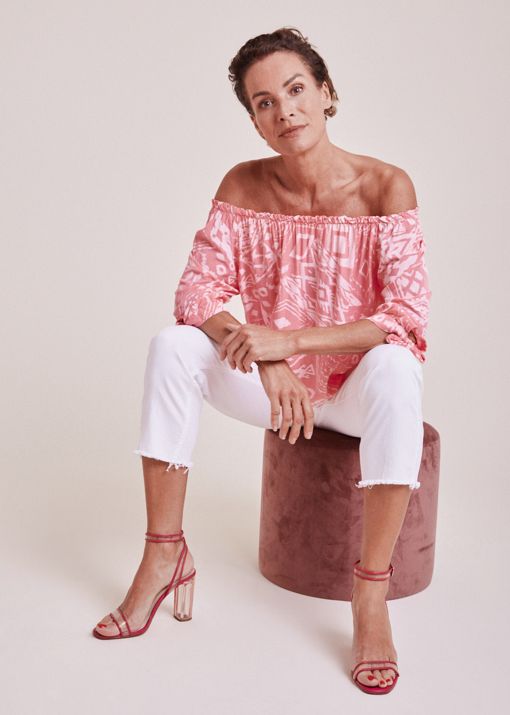 Elegante Bluse mit Carmen-Ausschnitt im pinken All-Over-Print. Die Bluse bietet durch den Gummizug im Ausschnitt Variation für dein Styling. Die 3/4-Ärmel sind leicht ballonartig geschnitten und werden am Bündchen mit einer Schmuckschleife geschlossen. Das Oberteil fällt locker um den Oberkörper.