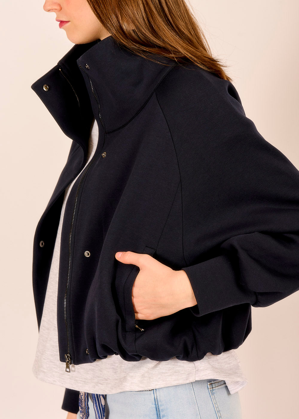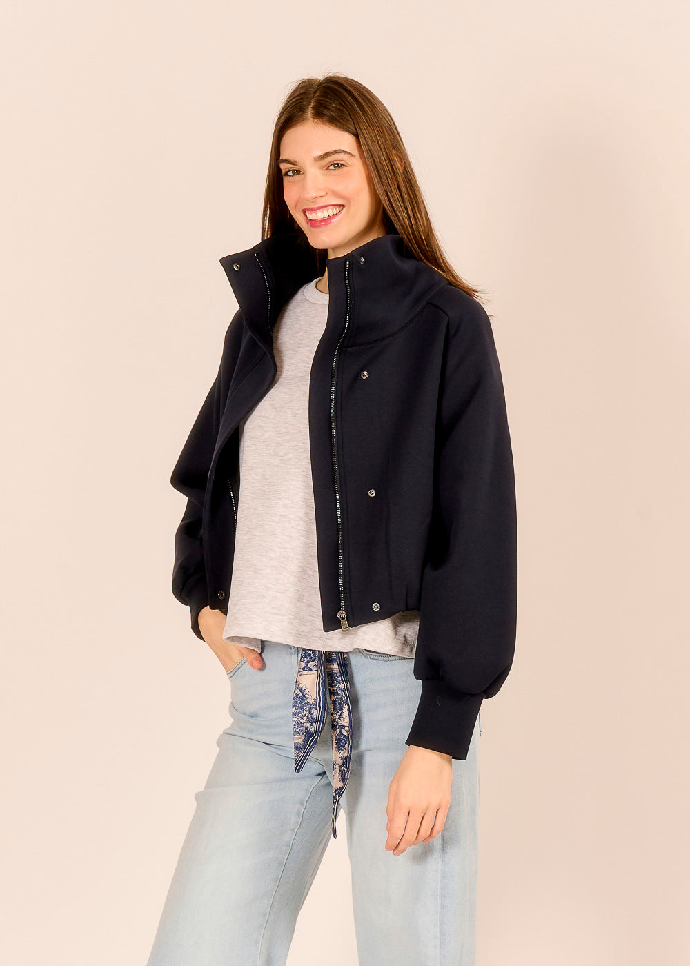 Der dunkelblaue Fashion Blouson ist der perfekte Alltagsbegleiter für alle, die ihrem Outfit mühelos eine stilbewusste Note verleihen wollen. Der moderne, kürzere Schnitt sorgt für einen geschoppten Look und der Kragen für eine besondere Coolness.